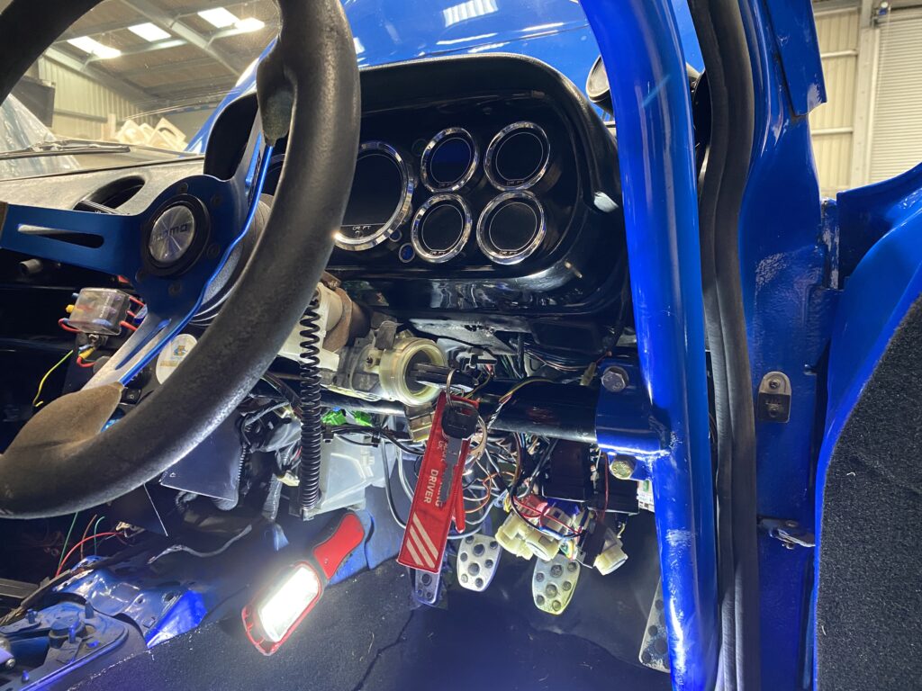Having removed the dashboard and released the wiring looms down – as they fell down two wires that had previously been sitting side-by-side in close proximity – probably for years – dropped to embrace each other. There was a deep orange glow and a whistle of the fire whipping up a cable. Luckily the isolation switch was close by and was reached before the spark could spread. The fire safety stick, always on hand, was mercifully not needed.