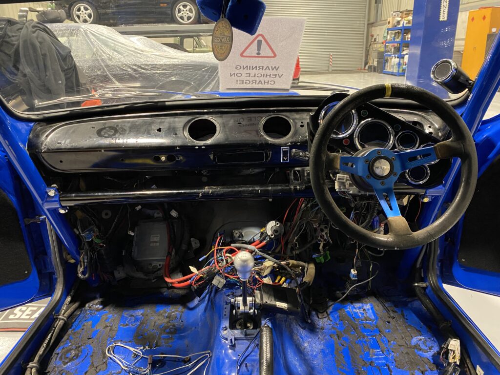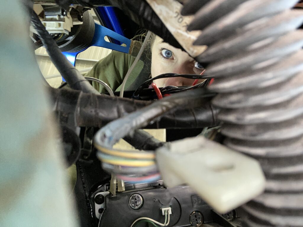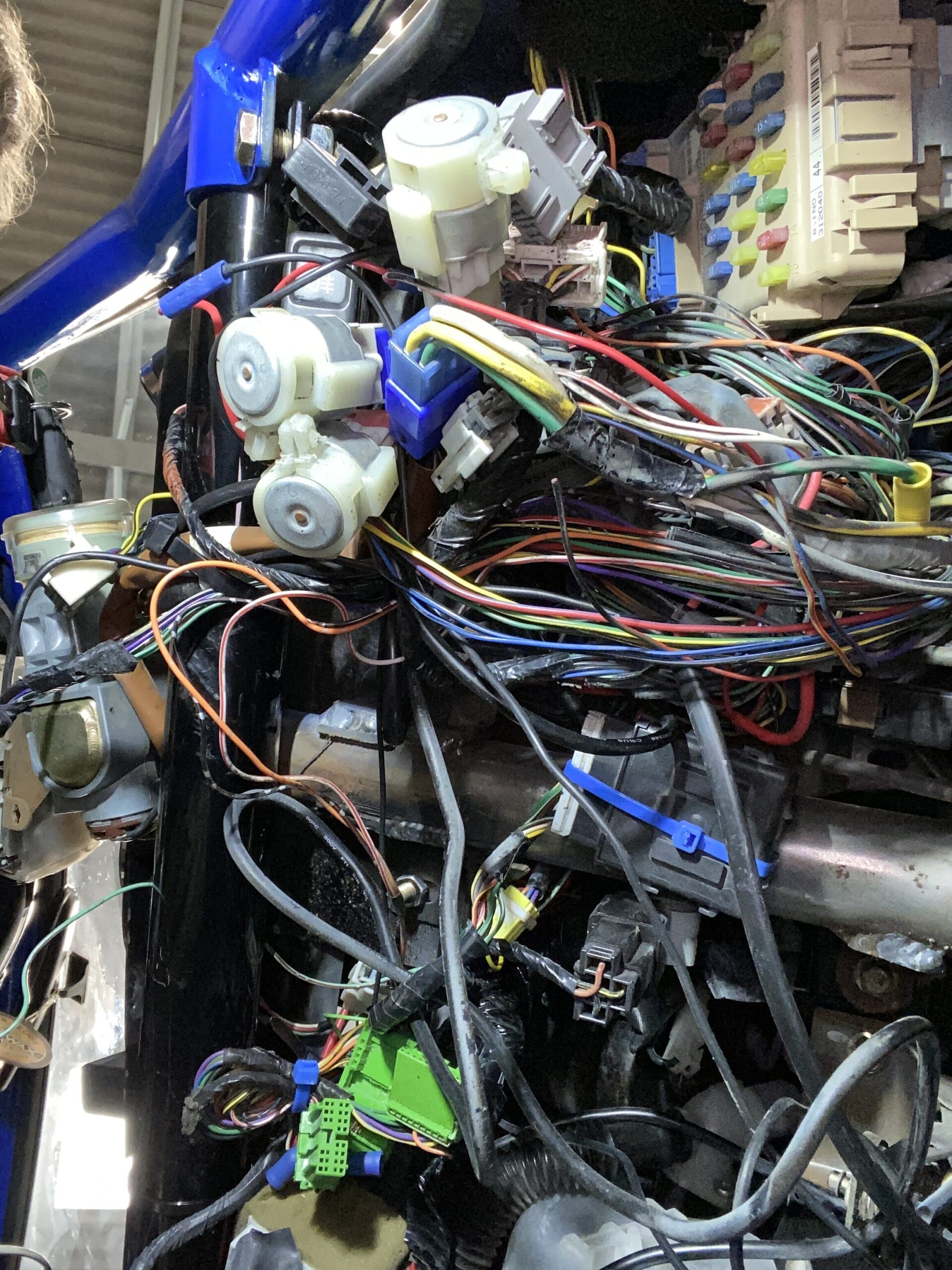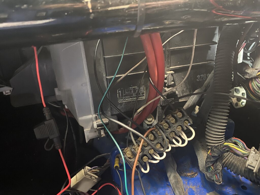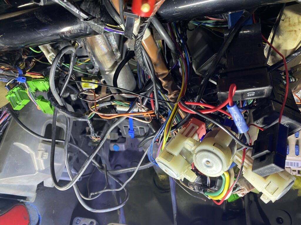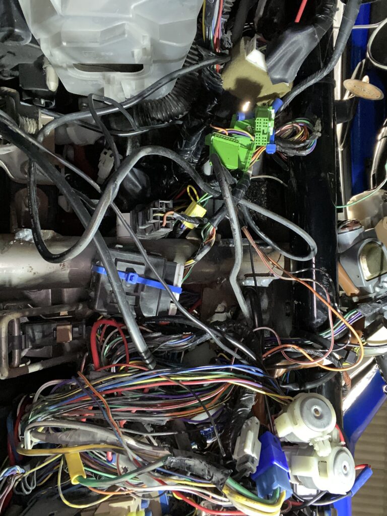 The speaker wires were a rats nest of pending disastrous proportions. These were all ripped out. It was still a mess under the dash so I had to make a plan of all the wires that were actually needed and work back from there: ECU check, lights, Horn, wipers, ignition…